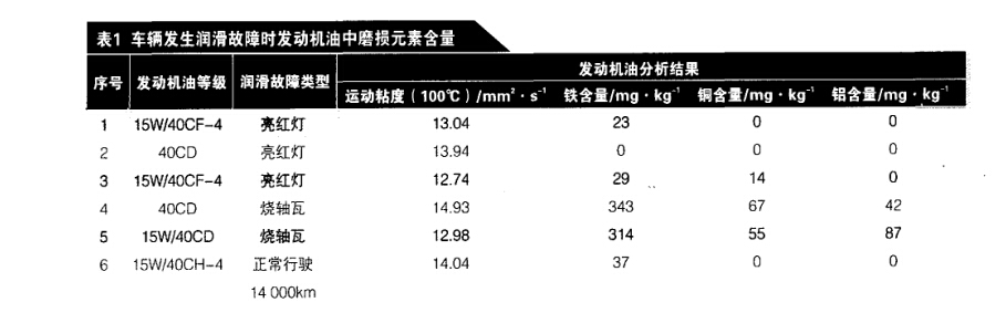 部分國內車輛設計者未從過去依 靠粘度保證潤滑的觀念上轉變過來, 將最小發動機油壓力設計得太高,使 發動機油壓力表在仍能很好潤滑的情 況下也亮紅燈。筆者曾通過測定車輛 發生潤滑故障時發動機油中磨損元素 (Fe、Cu、Pb )含量的變化對這一情 況進行跟蹤,分析數據見表1。