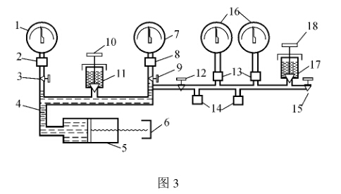 從上面的分析可以看出’每次增減壓過程只能 校準一塊壓力表,造成重復操作多。根據帕斯卡液 壓傳遞原理,管路中各點的壓力是一致的,如果將這 個壓力引出來,增加被校壓力表的數量,就可以達到 一次升降檢定多個壓力表的目的,所以需要在原來 壓力表校驗后上稍加改進,增加一個延伸裝置,提高 被校壓力表一次安裝的數量。