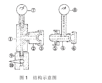 本閥門座由8部分組成,其結構名稱是①三通體,②連接 體,③絲堵,④檢測三通體,⑤檢測三通體鎖母,⑥檢測絲堵, ⑦被檢壓力(負壓)表,⑧標準壓力(負壓)表,⑨系統控制閥, ⑩開關閥門扳手。見圖1。
