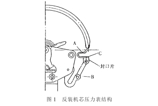 目前,我國生產的一般壓力表和精密壓力表均 采用傳統的正裝機心結構。由于正裝機心壓力表上 的機心是用螺釘緊固在接頭上,連桿和機心扇形齒 輪的連接由螺釘緊固,采用轉動機心或移動連桿的 方式進行儀表調整。這種方法巳被廣大的壓力計量 檢定維修人員所熟悉。而反裝機心壓力表,在安裝時 是把機心鉚接在接頭上,表盤鉚在機心上,連桿和機 心扇形齒輪的連接也是鉚接,這令許多檢定人員在 檢定和維修時很不適應,也很不習慣,不知如何對這 種反裝機心的壓力表進行調校與維修。