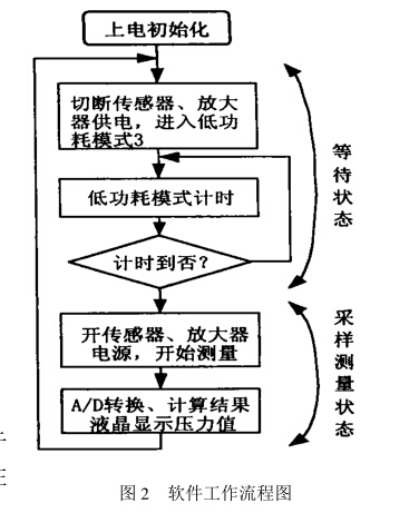 設(shè)計是圍繞如何實現(xiàn)低功耗展開的根據(jù)設(shè)計要求,傳感器橋臂電阻為8 k8,假設(shè)用3V 電池供電,電池容量為2 Ah,則儀表可連續(xù)工作200 d左右,無法滿足設(shè)計要求最初的設(shè)想 是在儀表上加裝手動開關(guān)或遙控開關(guān),在工作時打開,不工作時關(guān)閉來降低功耗這一想法很 快被否定,由于儀表可能安裝在不易接觸到的高處,遙控接收裝置要長期耗電,而且如果儀表 用于長期監(jiān)測,不論是哪一種開關(guān)都不能從根本上達(dá)到降低功耗的目的從外部控制功耗的方 案看來不可行,必須從內(nèi)部著手經(jīng)過反復(fù)推敲,我們發(fā)現(xiàn)通過單片機軟件來控制壓力傳感器 的供電和采樣以及計算和顯示測量結(jié)果是一個最優(yōu)化方案,系統(tǒng)的基本組成如圖1,單片機軟 件工作流程如圖2
