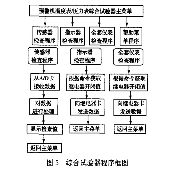 當檢查指示器時,程序可根據檢測的需要,通 過繼電器控制卡控制適配器轉換電路上相應的繼 電器通或斷,實現溫度/壓力表指示器同計算機之 間的連接;與此同時,繼電器控制卡控傳感器信號 產生電路,使其產生兩個高精度電阻,以模擬壓力 傳感器,其產生標準的傳感器信號加到指示器上, 來完成對溫度/壓力指示器的效驗,如果指示器指 示值在其誤差范圍內,則說明指示器工作正常,否 則故障。PC104采集卡還用于測量電壓/電流傳感 器輸出的代表被測儀表所需的電壓、電流大小,以 檢測供電電壓和儀表所消耗的電流是否符合要求。 電源包括3個直流電壓模塊,為設備提供所需電 源。