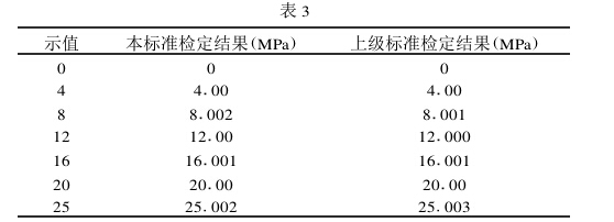 選取一塊測(cè)量范圍為(0?25) MPa,分辯力為 0.5MPa,準(zhǔn)確度等級(jí)為1.5級(jí)的一般壓力表,按4中所 述方法進(jìn)行測(cè)量,并將測(cè)量結(jié)果與該表的上級(jí)標(biāo)準(zhǔn)檢定 結(jié)果相比較,見(jiàn)表3: