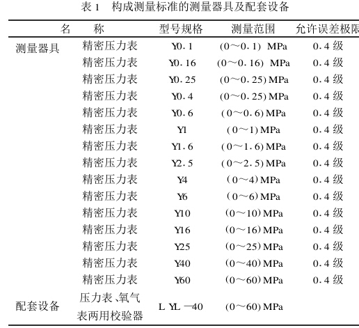 本裝置由十五塊精密壓力表(見(jiàn)表1)組成,配套設(shè) 備為一臺(tái)壓力表、氧氣表兩用校驗(yàn)器。