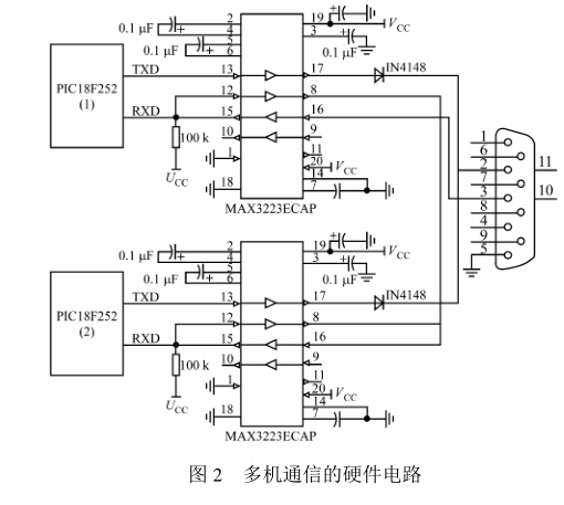 該多機通信系統除了單片機RS232C通信的硬 件要求外,還釆用了一塊MAX3223ECAP芯片和 一個IN4148 二極管實現多機通信的硬件電路,如 圖2所示。