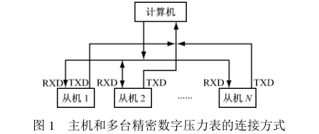 圖1為主機和多臺精密數字壓力表的連接方 式。其中計算機作為主機,釆用查詢方式接收從機 發來的數據;各壓力表作為從機,釆用中斷方式接收 從主機發來的數據。