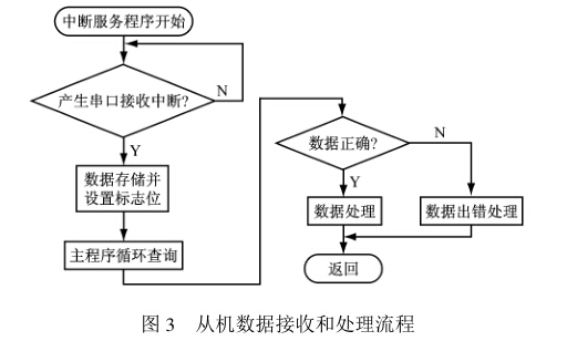 精密數字壓力表釆用PIC18F252作為主控芯 片,其軟件編程語言釆用C語言,在MAPLAB IDE 平臺上開發,利用PICC- 18編譯工具編譯。從機 軟件功能為實現壓力表地址分配(不允許2臺不同 的壓力表具有相同的地址值)以及對主機查詢信息 命令的中斷響應。壓力表地址分配是由按鍵處理子 文件實現的,通過進入壓力表的菜單模式下地址處 理子菜單St - AD進行相應按鍵操作,最終將設定 好的地址值保存到PIC18F252自帶的EEPROM 中。設定壓力表地址值后,主機對從機進行數據查 詢時,從機在USART接收中斷服務程序中完成對 數據的保存,并置位標志位,等待主程序循環對所接 收數據進行處理。從機數據接收及處理程序流程如 圖 3 所示 。
