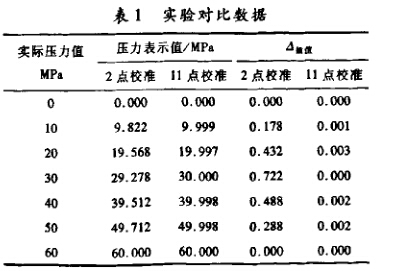從表1中可以得出,兩點(diǎn)校準(zhǔn)方式在靠近o 點(diǎn)和滿量程點(diǎn)時精度較高,在中間段時誤差較大, 精度較低,因此兩點(diǎn)校準(zhǔn)方式只適合對精度要求 較低的場合。而本系統(tǒng)采用的多點(diǎn)校準(zhǔn)方式,較 準(zhǔn)確地?cái)M合了壓力傳感器輸出曲線,很大程度上 提髙了測量精度,滿足了本系統(tǒng)對壓力測量高精 度的要求。