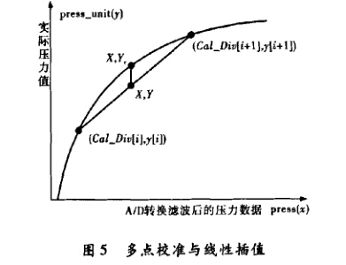 本系統(tǒng)最終采用11點(diǎn)校準(zhǔn)的方式,即滿量程 的0%, 10%, 20%,…,100%,校準(zhǔn)完成后,將校 準(zhǔn)數(shù)據(jù)存人Flash數(shù)據(jù)存儲區(qū)。計(jì)算 當(dāng)前壓力值時,首先將得到的當(dāng)前壓力數(shù)據(jù)與校 準(zhǔn)數(shù)據(jù)比較,得到當(dāng)前壓力數(shù)據(jù)所在 的區(qū)間,采用線性插值的方法計(jì)算當(dāng)前壓力值:
