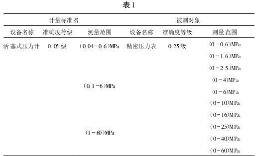 1. 3測量方法:根據液體靜力學原理,將0. 25級、(0 ~ 0. 6)MPa被檢精密壓力表按規定安裝在0. 05級、(0. 1 ~ 6)MPa活塞壓力計上,即由0. 05級活塞式壓力計產生的 壓力與精密壓力表指針所指示的壓力相比較來完成。