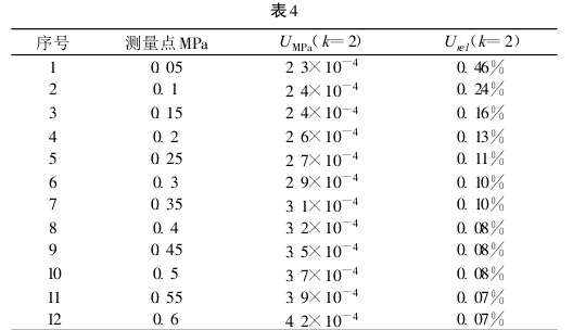 6. 1由以上計算可知,根據JJG49-1999的規定,測量點 應不少于8個點,即測量范圍(0 ~ 0. 6)MPa精密壓力表, 分別對 0. 05 MPa、0. 1 MPa、0. 15 MPa、0. 2 MPa、0. 25 MPa 、0 . 3 MPa、0. 35 MPa、0. 4 MPa、0 . 45 MPa、0. 5 MPa、0. 55 MPa、0. 6MPa測量點進行擴展不確定度及相對擴展不確 定度評估見表4 :