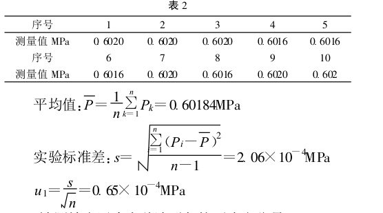 為了獲得重復性測量的不確定度,使用測量范圍 (0. 04~ 0.6)MPa活塞壓力計,對測量范圍(0~0. 6)MPa 精密壓力表,0. 6MPa測量點進行10次獨立測量,測得數 據如表2: