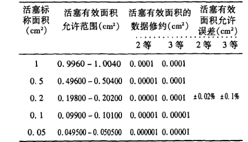 主要是指確定活塞有效面積的不確定度及有效面積 的變化引起的壓力測量誤差,可以通過檢定活塞有效面積 與調整專用砝碼的質量來減小測量誤差。活塞有效面積的 允許誤差如下表: