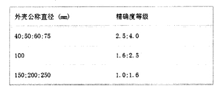 機械壓力表中的彈性敏感元件隨著壓力的變化而產生彈性變形。機械壓 力表采用彈簧管(波登管),膜片,膜盒及波紋管等敏感元件并按此分類所測童 的壓力一般視為相對壓力。一般相對點選為大氣壓力。彈性元件在介質壓力 作用下產生的彈性變形,通過壓力表的齒輪傳動機構放大,壓力表就會顯示出 相對于大氣壓的相對值(或髙或低)。一般壓力表的測量精確度等級和表盤直徑 的關系如下表: