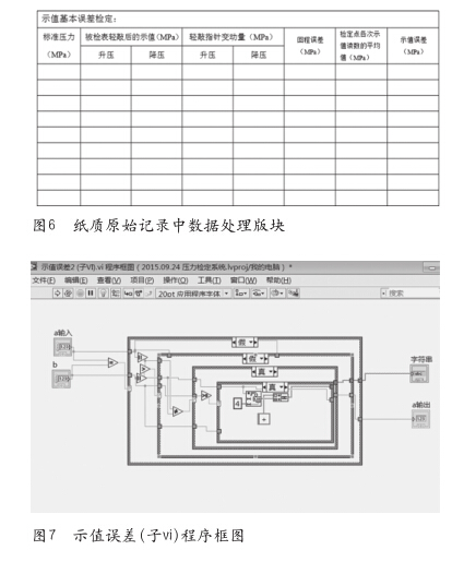 根據(jù)精密(一般)壓力表的國家檢定 規(guī)程,對被檢壓力表實施檢定后需對檢 定結(jié)果進行分析及處理,主要是獲得回 程誤差、平均值和示值誤差,紙質(zhì)原始記 錄中的數(shù)據(jù)處理板塊如圖6所示。在上位 機程序編程的實現(xiàn)過程中,回程誤差及 平均值比較簡單,而示值誤差比較復雜。 本系統(tǒng)自主編寫了示值誤差子vi,能夠準確地進行示值誤差計算,該子^的程序框 圖如圖7所示。