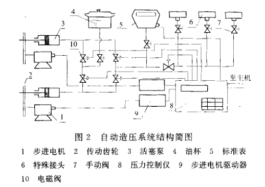 系統采用兩臺步進電機帶動兩臺活塞壓力泵造 壓,目的是提高造壓速度,以適應多臺表同時檢定或某 些要求用油量較大的場合。其中一臺活塞壓力栗處于 造壓階段時(即向油路注油).另一臺處于造壓準備階 段(即從油杯中吸油)。處于造壓階段的步進電機由單 片機經D/A轉換器及V/F轉換電路進行控制,處于 造壓準備階段的步進電機則由邏輯電路(阻容充/放電 電路與V/F轉換電路)控制。油路的切換采用電磁閥 控制,其優點是密閉性好,從而保證系統有較高的造壓 速度和靜態壓力穩定性。系統在被檢表與標準表油路 間加裝電磁閥,目的是在造壓換栗前切斷被檢表油路 與造壓油路間的聯系。待換泵完成,且造壓油路重新恢 復換泵前壓力時,再將電磁閥打開,這樣可消除換栗過 程中可能產生的系統壓力波動。