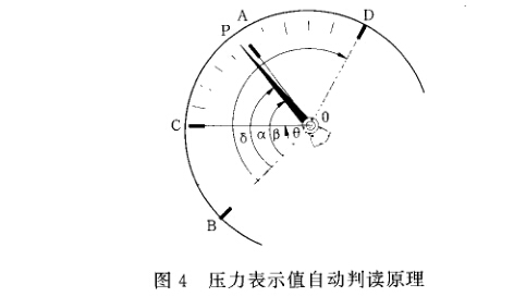示值計算方法如圖4所示。以刻度盤圓心(指針轉 鈾)為極點,儀表下限刻度OB為極軸,按順時針方向 建立極坐標系。利用表盤粗刻線及指針對應極角的大 小,確定指針所指示的壓力值。假定指定檢定點及相鄰的前后檢定點分別為A、C、D,指針中心線矢徑為OP, 它們的極角為a、0、S、(3,對應壓力值分別為a、c、d、p,則 儀表指針的示值由下式計算。