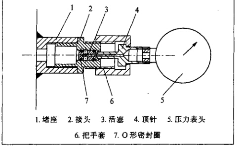 如圖所示,堵座直接焊接在所要測定壓力的輸 油(水)管線上。首先把活塞和接頭裝配好,把接頭裝 在堵座上,這樣在管道壓力(一般在10MPa左右)作 用下,活塞向上移動,形成密封,這些部件裝好后直 接放在井上。另外一些部件按圖示,把頂針塞人把手 套,裝上壓力表,要測壓力時隨身攜帶。使用時將把 手套慢慢旋上接頭,由于管內壓力,在旋入的過程當 中,頂針接觸活塞,此時頂針與活塞形成第一道硬密 封,在進一步的旋入過程中,活塞繼續向前推移,管 線內液體從活塞側面孔進入頂針孔,即可測得壓 力。設計時考慮到第一道硬密封接觸面積小,有時密 封性能不佳,在結構上可以設計第二道硬密封,即可 實現在測壓力時滴水不漏。