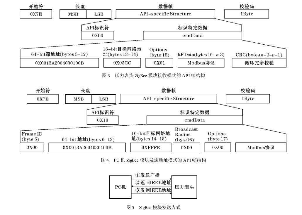 由于受到石油礦井工作規程限制,為了使壓力表方便操作,采用ZigBee模塊間無線通信方式,實現標定 軟件與壓力表的數據傳輸,校正壓力表傳感器的精度,保證計量的準確性。這就要使基于數據鏈路層的Modbus協 議與基于網絡層的API模式下ZigBee進行通信,采用在Modbus的基礎上加上API的協議層的方法來實現。實驗 結果表明,無線通信模式提高了傳輸數據的準確性。