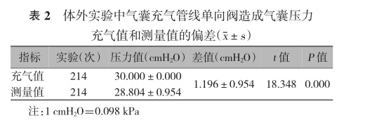 2.1.2充氣管線單向閥造成氣囊壓力充氣值和測量 值的偏差(表2):經過214次的反復實驗,得到氣囊 接口單向閥斷開和連接造成氣囊壓力充氣值和測量 值之間的偏差,差異有統計學意義(t=18.348,P= 0.000)。