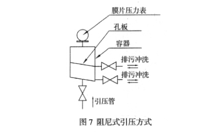 關于膜片壓力表的研宄已經取得了很多理論成果,但是 在測量惡劣介質時,膜片壓力表很容易失效,多則半年,少則1個 月;為了延長膜片的壽命,提出了一種阻尼式引壓方式來對膜片 進行保護,流程圖,如圖7所示。在測量時,由于孔板的阻尼作用, 可以有效衰減介質的脈動效應,更好的保護膜片;同時對于易凝 固介質,可以通過排污沖洗閥門進行沖洗排污。經現場使用檢驗, 可以使膜片壓力表的壽命延長至兩年以上。