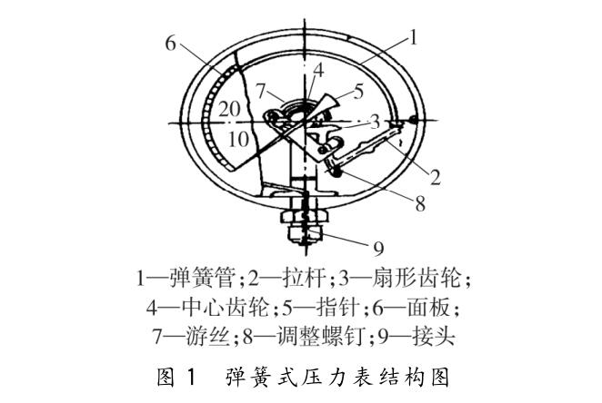 在化工企業中,最常使用的則是彈簧式壓力表, 且主要由接頭、度盤、指針、稱圈、傳動機構等組成, 具體如圖1所示。