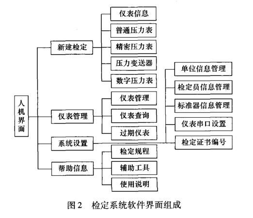 系統(tǒng)軟件以Visual C + + 6. 0為開發(fā)平臺,采用基 于ODBC的數(shù)據(jù)庫管理系統(tǒng),數(shù)據(jù)庫系統(tǒng)采用Mi-crosoft Accesso系統(tǒng)軟件可實現(xiàn)壓力數(shù)據(jù)的自動米集 和自動保存,并根據(jù)檢定儀表信息智能判斷被檢儀表 是否合格,能自動生成并打印檢定原始記錄和檢定證 書,能建立被檢壓力表信息,可查詢歷史檢定記錄,便 于壓力表檢定信息管理,原始記錄模板以及檢定證書 模板可在Word中自由編輯,靈活方便。圖2所示為 本文所述檢定系統(tǒng)軟件界面組成框圖,采用多級菜單 模式實現(xiàn)儀表的新建檢定、儀表管理、系統(tǒng)設(shè)置、幫助 信息等功能。