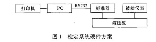檢定系統(tǒng)標準器采用HX601智能壓力校驗儀,液 壓源可采用便攜式HX671手動液壓源(0 ~60 MPa), 便于隨I&應急檢定;也可采用固定液壓臺,各安裝一臺 工作穩(wěn)定、性能優(yōu)良的正壓泵(SC-YBS-F2)與一臺真 空泵(SC-YBS-F1),實現(xiàn)壓力表正壓與負壓的集中檢 定。圖1所示為檢定系統(tǒng)硬件方案組成框圖。