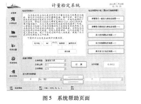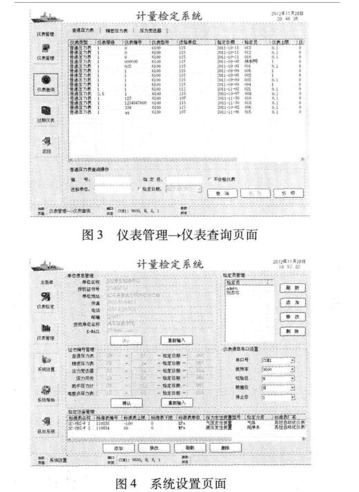 新建檢定菜單下主要包括儀表信息、普通壓力表、 精密壓力表、壓力變送器、數(shù)字壓力表等頁面;其中儀 表信息頁面主要用于被檢儀表基本信息的填寫、檢定 參數(shù)設(shè)置及標準器的選擇;其他頁面則主要用于各型 壓力表的具體檢定操作。儀表管理實現(xiàn)未檢儀表信息 的錄人、已檢儀表信息的查詢及過期儀表查詢等,圖3 所示為儀表管理菜單下的儀表査詢頁面。圖4所示為 系統(tǒng)設(shè)置頁面,實現(xiàn)檢定單位、檢定員、標準器、標準器 串口、證書編號等信息管理。圖5所示為系統(tǒng)幫助頁 面,可提供常用檢定規(guī)程查詢、誤差計算及單位換算 等。
