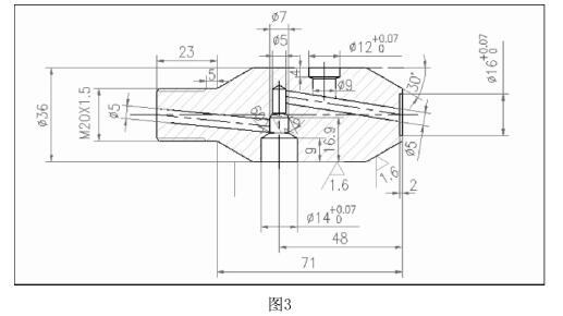 斜孔和斜面的加工工藝:為了使閥體看上去更美觀,更小巧、就簡 潔,所以是閥體盡可能的縮小長度。所以采用在閥體內打斜孔以減少長 度。如圖3: