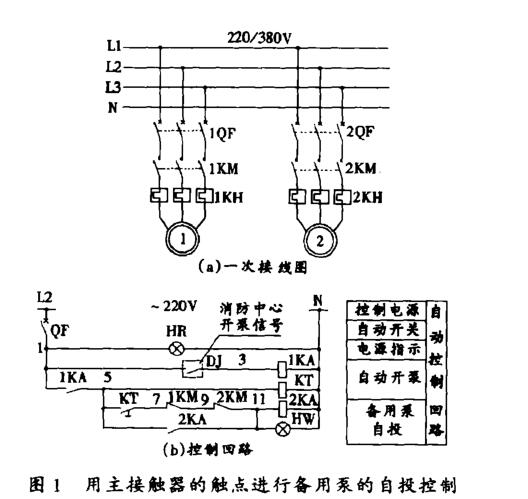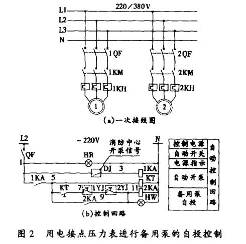 在電氣工程設計中,常遇到消防泵(包括消火 栓泵、噴淋泵、卷簾泵的電氣控制問題。一般情 況下消防泵為兩臺,一臺工作一臺備用,在工作泵 出現故障時,備用泵必須盡快自投滿足火災時對 消防水的要求,以盡快撲滅火災,把損失降到最 低。設計中包括各手冊及標準圖),備用泵的自投 多采用在控制回路中接人主接觸器的常閉觸點來實 現。筆者最近在幾個工程的設計中,采用電接點壓 力表對備用泵進行自投控制,經過調試、驗收,反 應良好。下面以全壓啟動消防泵為例對兩種方案 進行比較,僅供讀者參考。