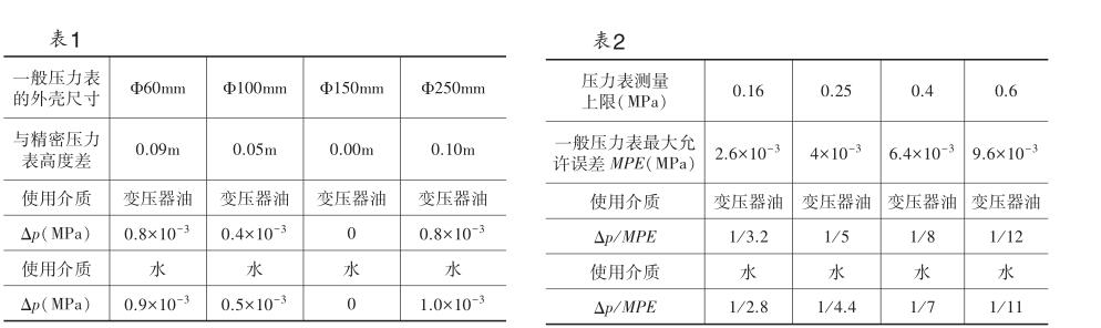 在壓力表檢定中,常使用油、水、空氣作為介質(zhì) 來(lái)傳遞壓力,對(duì)壓力表進(jìn)行檢定。油、水、空氣等統(tǒng) 稱為流體。如圖1所示,在一般壓力表檢定過(guò)程中, 由于一般壓力表的外売尺寸不同,造成被檢壓力表 與精密壓力表中心軸不在同一高度,即兩者之間存 在高度差。若設(shè)處于較高位置的壓力表處的壓力為 p0,則處于較低位置的壓力表處的壓力為p =p0+pgh。 檢定壓力表時(shí),隨著檢定壓力增加xp,則基本方程變 為p +xp = (p0+xp ) +pgh。因而測(cè)量高度差的存在在檢定 過(guò)程中始終會(huì)對(duì)檢定結(jié)果帶來(lái)一定的影響。這種影 響,隨著壓力表測(cè)量上限的降低而增大,隨著一般壓力表與精密壓力表兩者外売尺寸相差增加而增大。目 前,一般壓力表的外売尺寸常見的有$60mm、 $100mm、$150mm、$250mm。精密壓力表的外売尺寸 一般為^ 150mm,大多數(shù)企業(yè)在檢定壓力表時(shí),通常 配備“壓力表/氧氣表兩用校驗(yàn)儀”或“壓力表校驗(yàn) 儀”,這些儀器常用的工作介質(zhì)為變壓器油(20°C時(shí), p=0.86x103kg/m3)和水(20°C 時(shí)p=1x103kg/m3)。在壓力 表檢定過(guò)程中,只讀取被檢壓力表與精密壓力表的示 值差,而忽略了被檢壓力表與精密壓力表因高度不同 帶來(lái)的附加誤差。有些單位在使用油為介質(zhì)的壓力表 校驗(yàn)儀上安裝油水隔離器檢定氧氣壓力表,這也會(huì)加 大被檢壓力表與精密壓力表的高度差,帶來(lái)更大的附 加誤差。因高度不同帶來(lái)的誤差計(jì)算公式為Ap =pgh (式中:p——液體密度;g——當(dāng)?shù)刂亓铀俣?h—— 被檢壓力表與精密壓力表高度差),當(dāng)高度差的存在 對(duì)檢定結(jié)果的影響不能忽略不計(jì)時(shí),就要對(duì)檢定結(jié)果 進(jìn)行修正。處于較高位置的壓力表示值加上Ap才能 與處于較低處壓力表實(shí)際壓力相等。下面,用表格的形式(見表1)對(duì)不同外売尺寸的被檢壓力表與精密壓 力表高度差對(duì)檢定結(jié)果的影響進(jìn)行分析,來(lái)確定高度 差對(duì)檢定結(jié)果的影響程度(徐州重力加速度g= 9.7967m/s2)。
