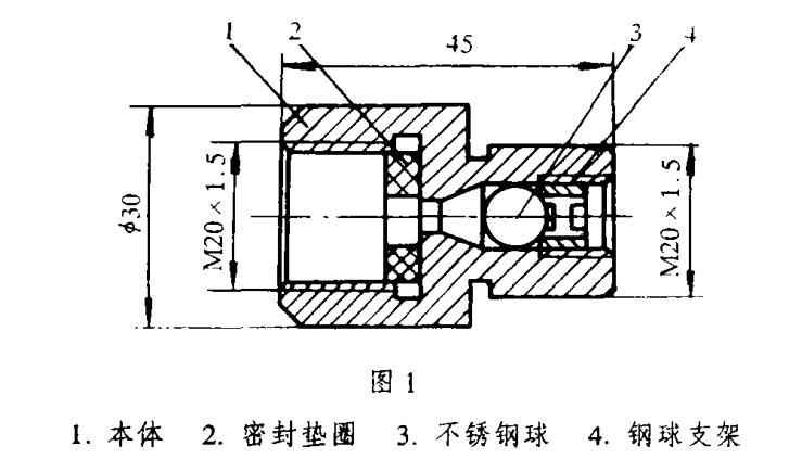 此裝置安裝在被保護(hù)件(例如壓力表與壓力 源之間裝置的一端用螺紋M20 x 1. 5)與被保護(hù)件 進(jìn)行聯(lián)接,另一端與壓力源聯(lián)接。正常情況下,當(dāng)被 保護(hù)件無泄漏時,鋼球3上下兩端的壓力相等 球依靠自重穩(wěn)定在鋼球支架4上,壓力介質(zhì)則順利 的流經(jīng)鋼球與本體1的縫隙進(jìn)入被保護(hù)件。當(dāng)被保 護(hù)件發(fā)生泄漏時,鋼球上下兩端產(chǎn)生壓差,鋼球迅 速上浮,嚴(yán)密封閉密封口,從而,切斷壓力源,使維 修人員得以有充分的時間關(guān)閉閥門,更換已經(jīng)損壞 的被保護(hù)件。此裝置適用于氣體、蒸汽和各種低粘 度液體介質(zhì)的泄漏保護(hù)。本裝置應(yīng)垂直安裝于壓力 源與被保護(hù)儀表(或裝置)之間,兩端接口內(nèi)車制有 M20X1.5的螺紋,供與被聯(lián)接件聯(lián)接。垂直安裝時 的傾斜角不得大于6度。