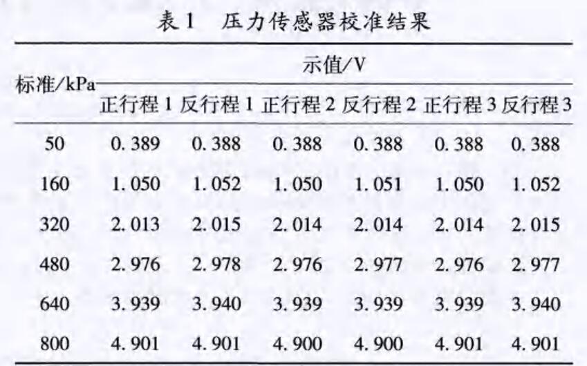本文以西安某生產的壓力傳感器為例說明o此壓力傳感器型號為GY-12H,測量范圍為0 ~ 800 kPa,準確度等級為0.2級,編號為20】1006,依據JJG 860-1994壓力傳感器(靜態)檢定規程,系統自動選 擇6個檢定點進行實驗,檢定結果如表1所示。