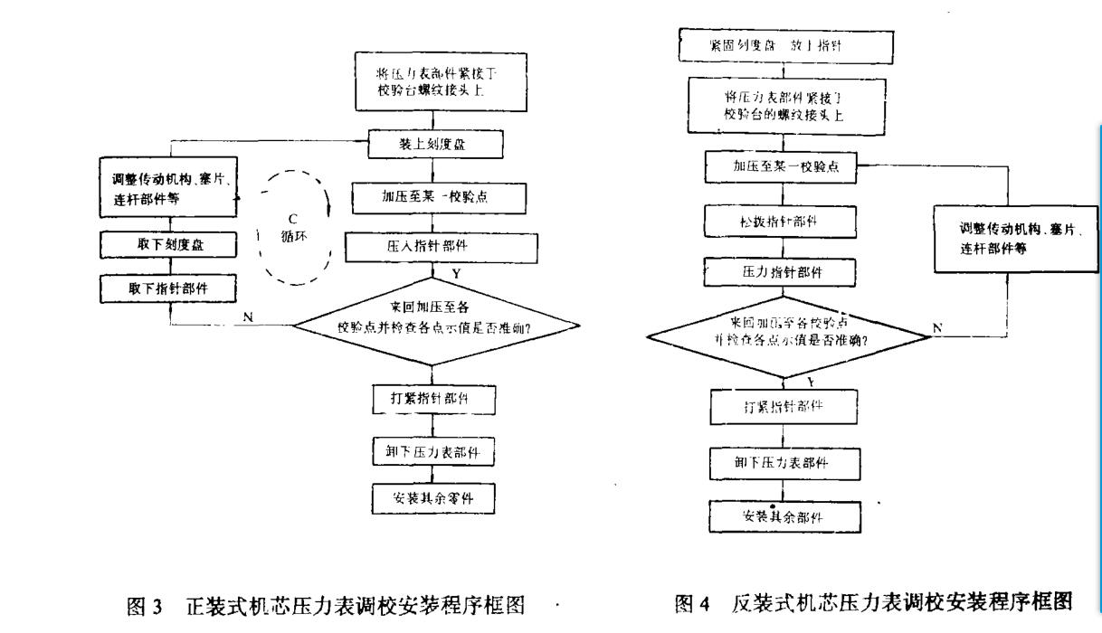 按照使用要求,壓力表的指針(圖1)在 隨機(jī)芯小齒輪轉(zhuǎn)動(dòng)過(guò)程中,要與謝度盤(pán)平行且 保持一定距離范圍,更不能相_V #正裝式 結(jié)構(gòu),為了保證這一要求,就秦:_上的平 面C與平面B、接頭的平面B與平#八有一 定的平行度公差要求;襯圈要緊壓刻度盤(pán).此 外,在用戶使用與檢定時(shí),有時(shí)由于操作者不 小心,圖方便,會(huì)通過(guò)扭動(dòng)壓力表底殼來(lái)將接頭螺絲擰入壓力管道的連接螺母里去,往往會(huì) 使底殼變形?改變平行性?嚴(yán)重時(shí)甚至使指針接觸到刻度盤(pán)。為此,接頭的延伸平板部位要 制得較厚,用鑄造或鍛壓制作表頭毛坯后,還 需對(duì)其D、A、B平面進(jìn)行銑削調(diào)校產(chǎn)品時(shí)也 費(fèi)時(shí)間.圖3是調(diào)校正裝式機(jī)芯壓力表時(shí)的程 序框圖。每個(gè)壓力表產(chǎn)品在調(diào)校時(shí)要作轉(zhuǎn)動(dòng)機(jī) 芯底版,調(diào)整連桿、塞片等工作。而每調(diào)整一 次都要將指針與刻度盤(pán)安上拿下,即圖3上的 C循環(huán)往往要重復(fù)多次。