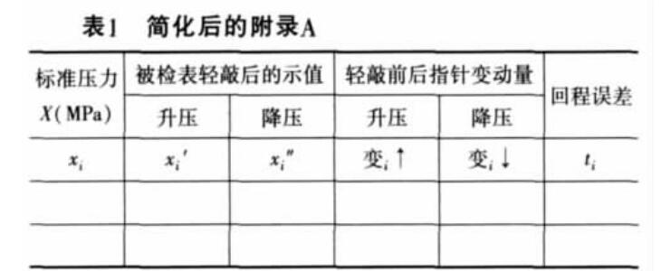 在此僅就與操作有關(guān)的項目進(jìn)行闡述。附錄A中, 有被檢表的分度值(設(shè)為6),有與被檢表準(zhǔn)確度等級有 關(guān)的允差范圍(設(shè)為±5),有升壓和降壓時的被檢表輕敲 后示值(設(shè)為x/和x,"),有輕敲前后被檢表的指針變動量 (設(shè)為變,丨、變,丨),有回程誤差(設(shè)為t),簡化的附錄A 如表1所示。