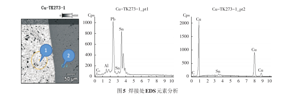 對焊接處進行微區(qū)能譜分析,如圖5所示。其 中彈簧管為純銅制造,焊料主要成分為Pb和Sn,有 微量的Al、Co雜質(zhì)元素。雜質(zhì)元素明顯會影響焊料 的潤濕性和流動性,加之封口塞的幾何外形容易有 氣隙和裂紋,使焊接點的強度下降。